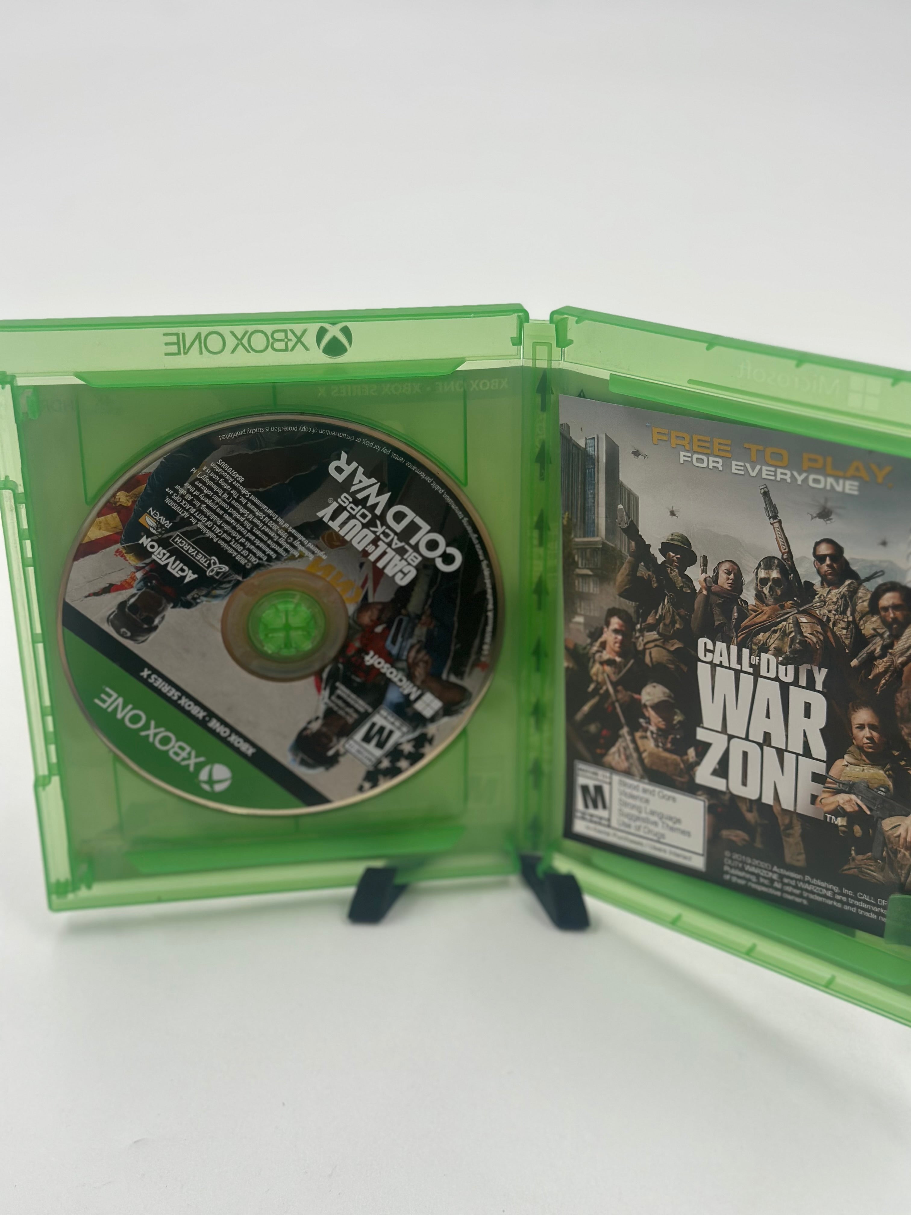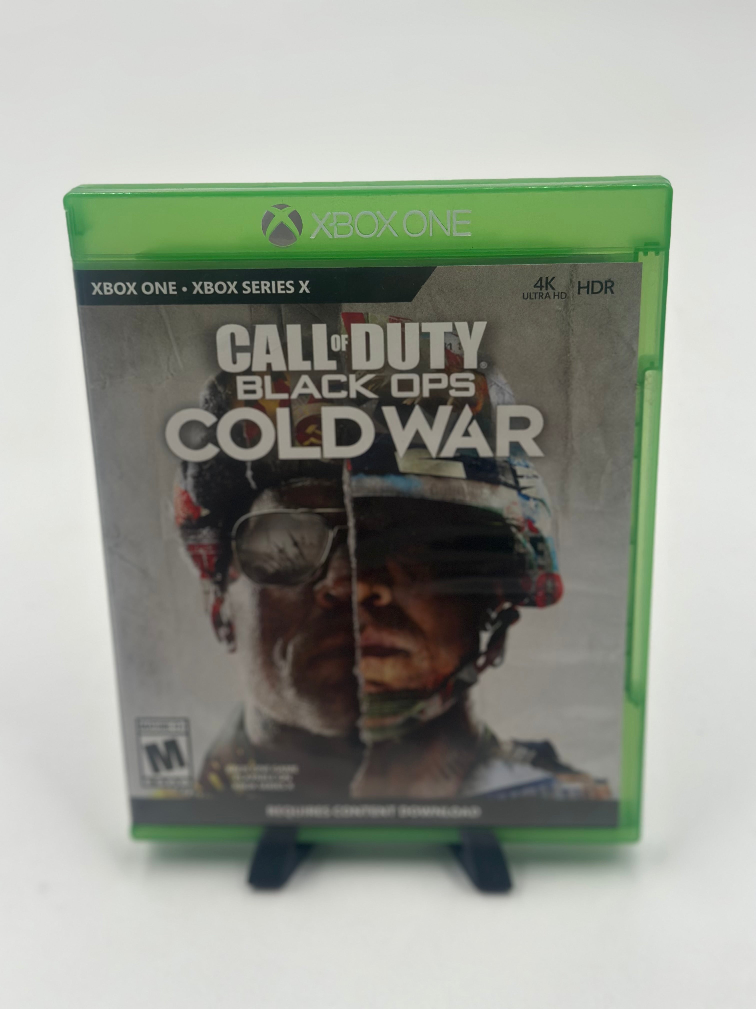 Call of Duty: Black Ops Cold War for Xbox One (2020) is a first-person shooter set in the early 1980s, featuring a campaign where players track a Soviet spy named Perseus, along with traditional multiplayer and Zombies modes. Developed by Treyarch and Raven, it focuses on Cold War espionage, featuring iconic characters like Woods, Mason, and Hudson.