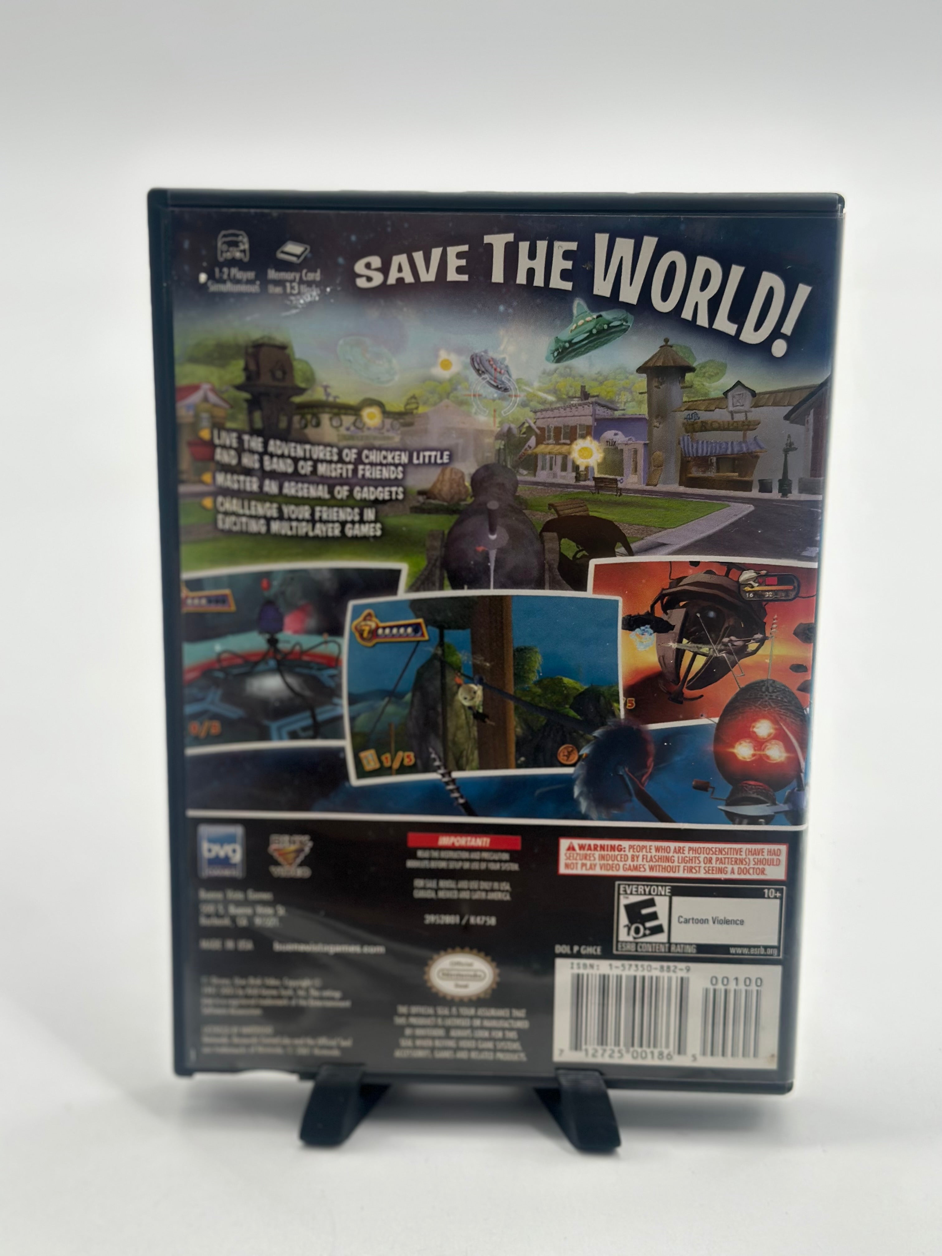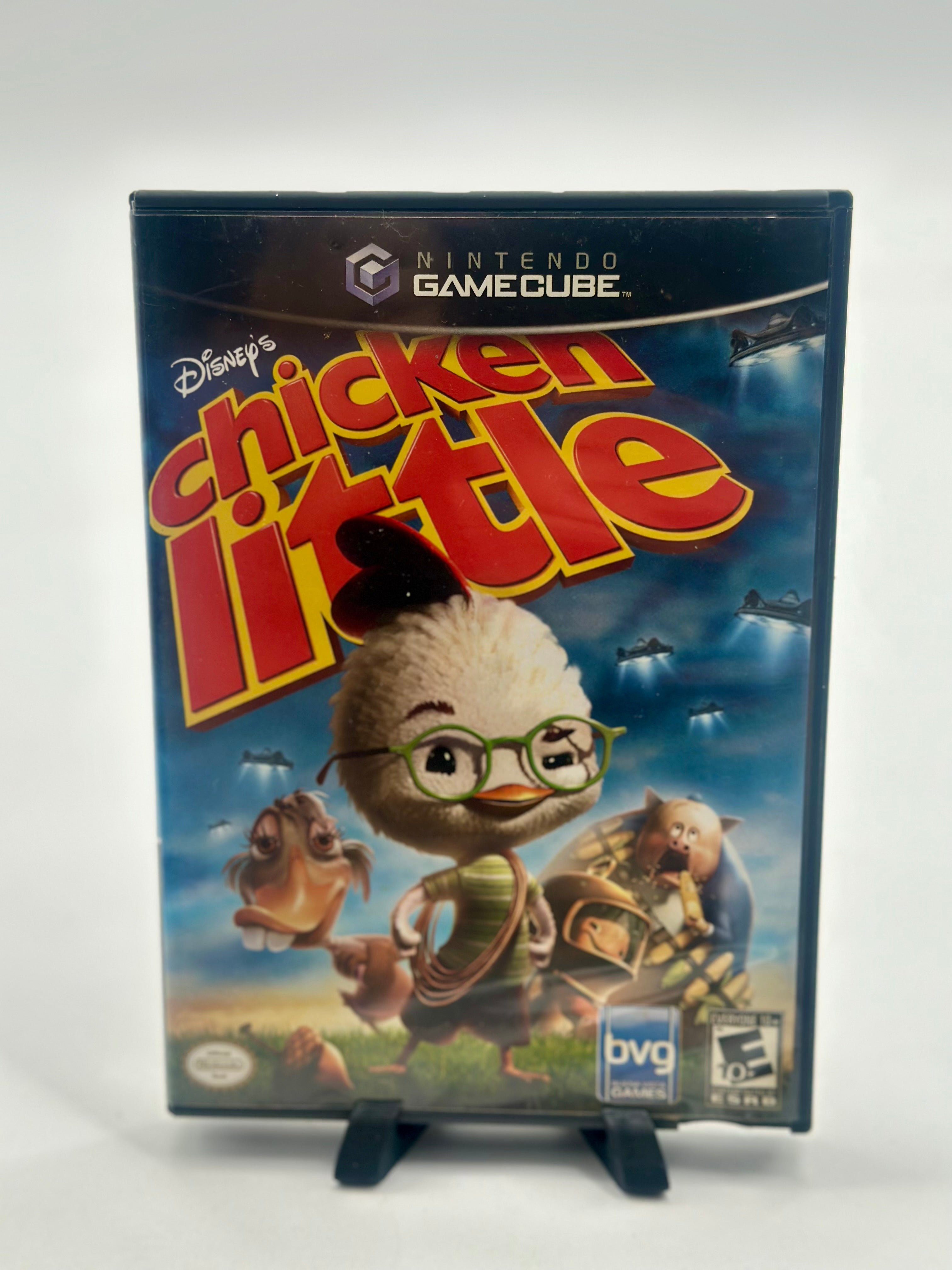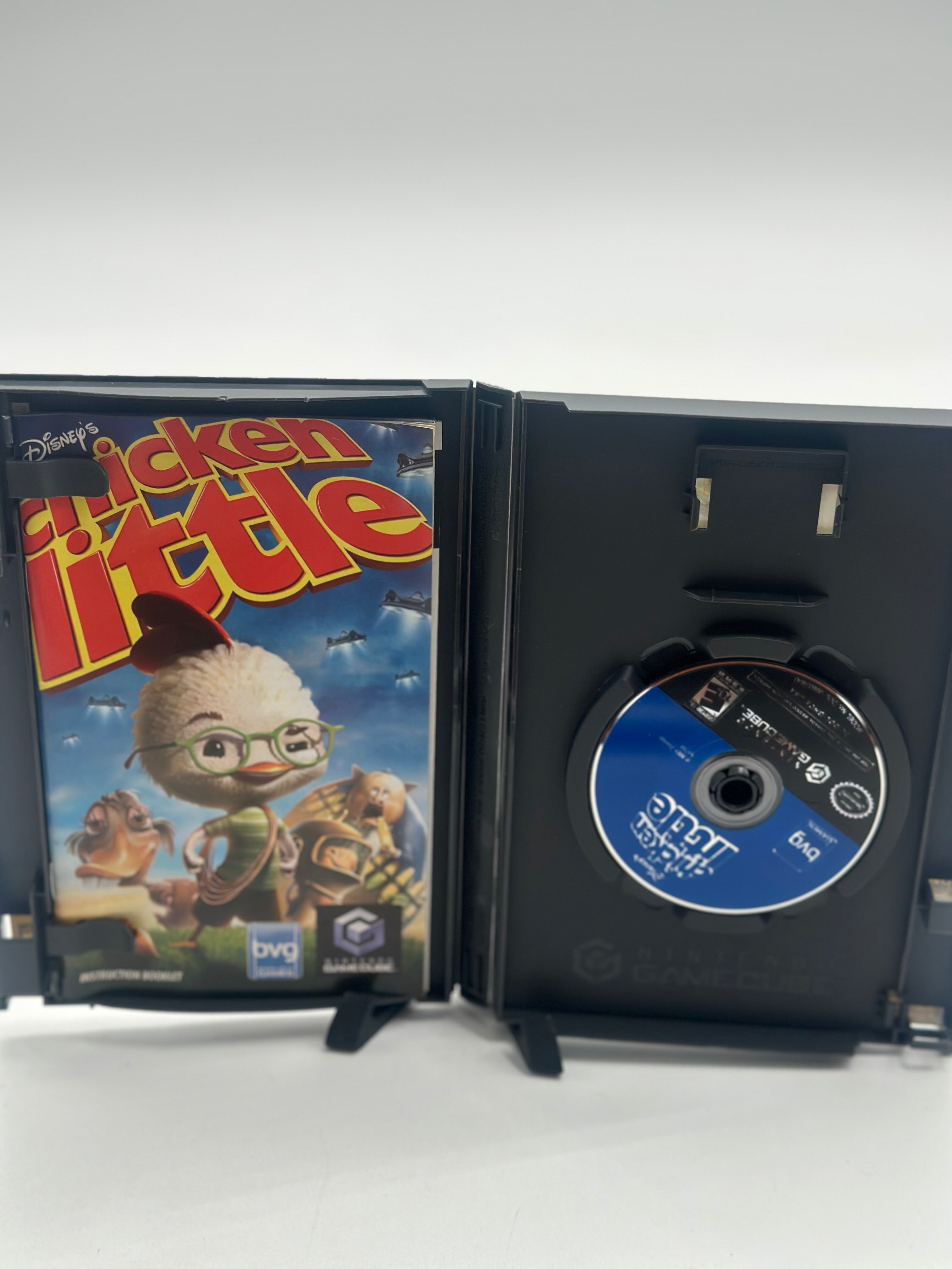 Chicken Little for the Nintendo GameCube is an action-adventure game developed by Avalanche Software and published by Buena Vista Games, released in 2005, that brings the story of the Disney animated film to life with 17 action-packed levels and the ability to play as the main characters: Chicken Little, Fish Out of Water, Abby Mallard, and Runt of the Litter. Players utilize a variety of unique gadgets like rocket jet packs and slingshots to navigate challenges such as alien invasions, corn field mazes, and even space. The game also includes multiplayer modes with mini-games unlocked by collecting baseball cards throughout the levels.