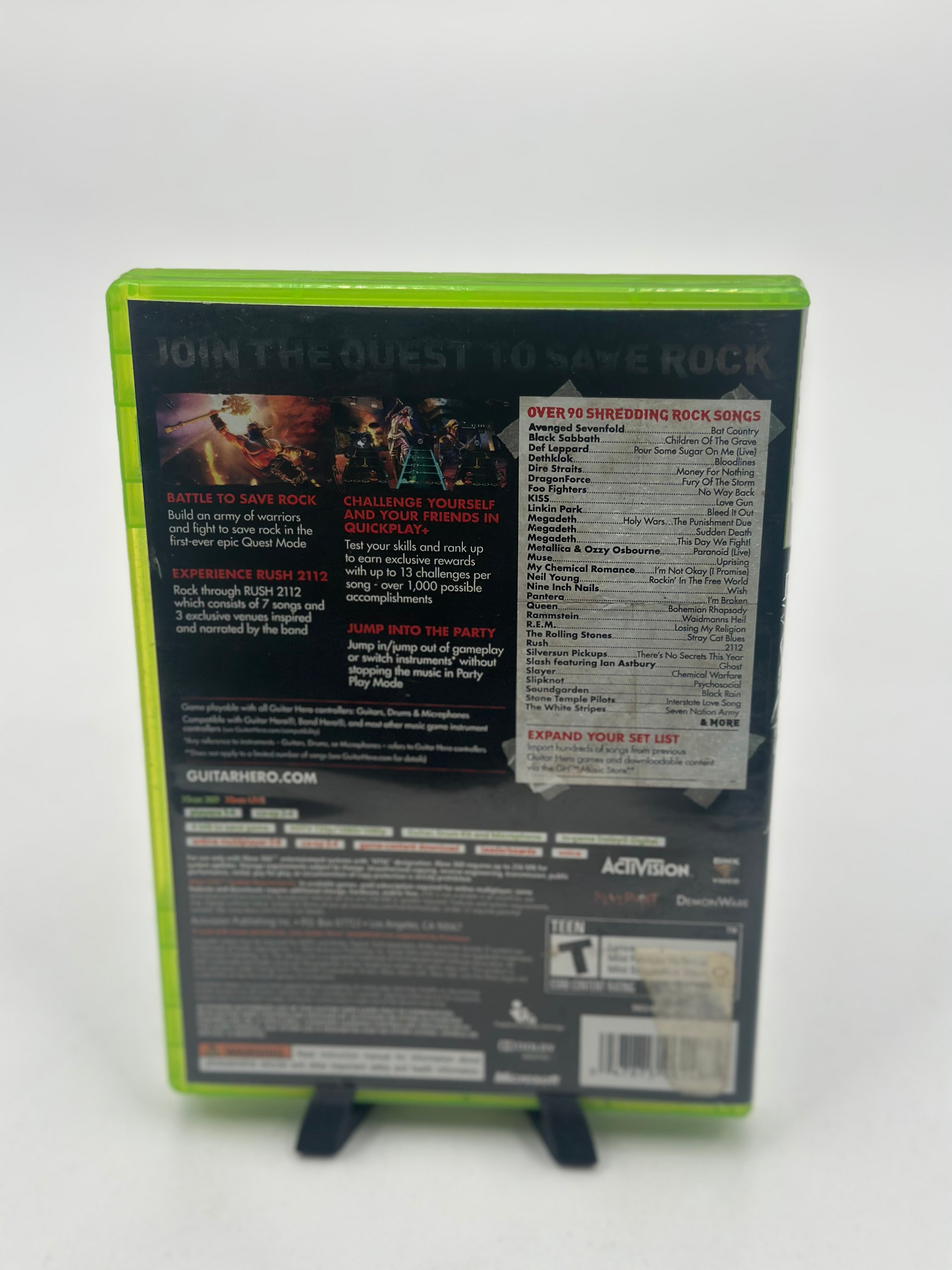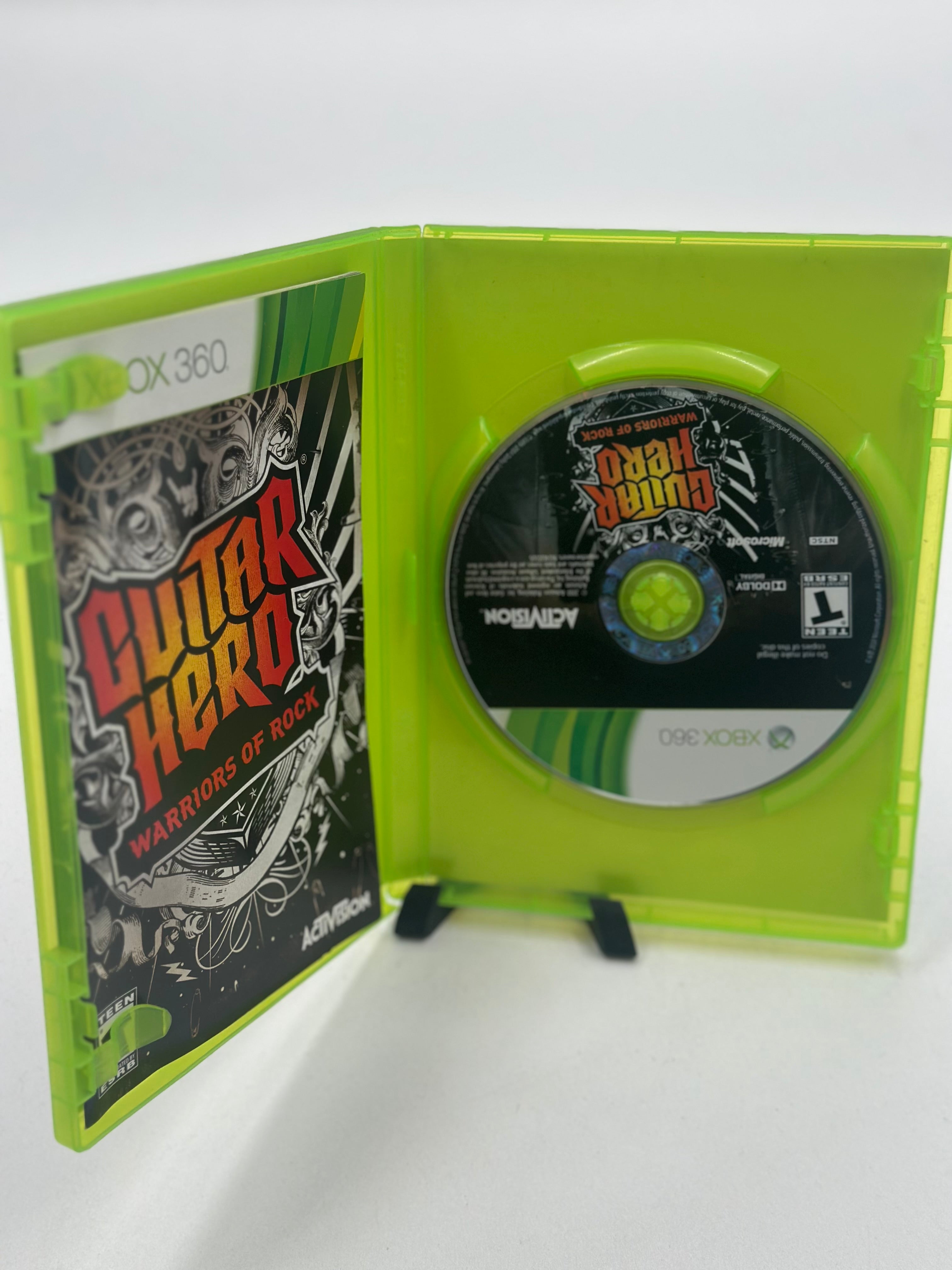 Guitar Hero: Warriors of Rock for Xbox 360 is a 2010 rhythm game featuring a quest to save rock 'n' roll, narrated by Gene Simmons, with over 90 hard-hitting tracks. It includes a story-driven campaign, competitive modes, and supports four-player band, guitar, or drum gameplay. The game is known for its challenging, fast-paced "shredding" focus.