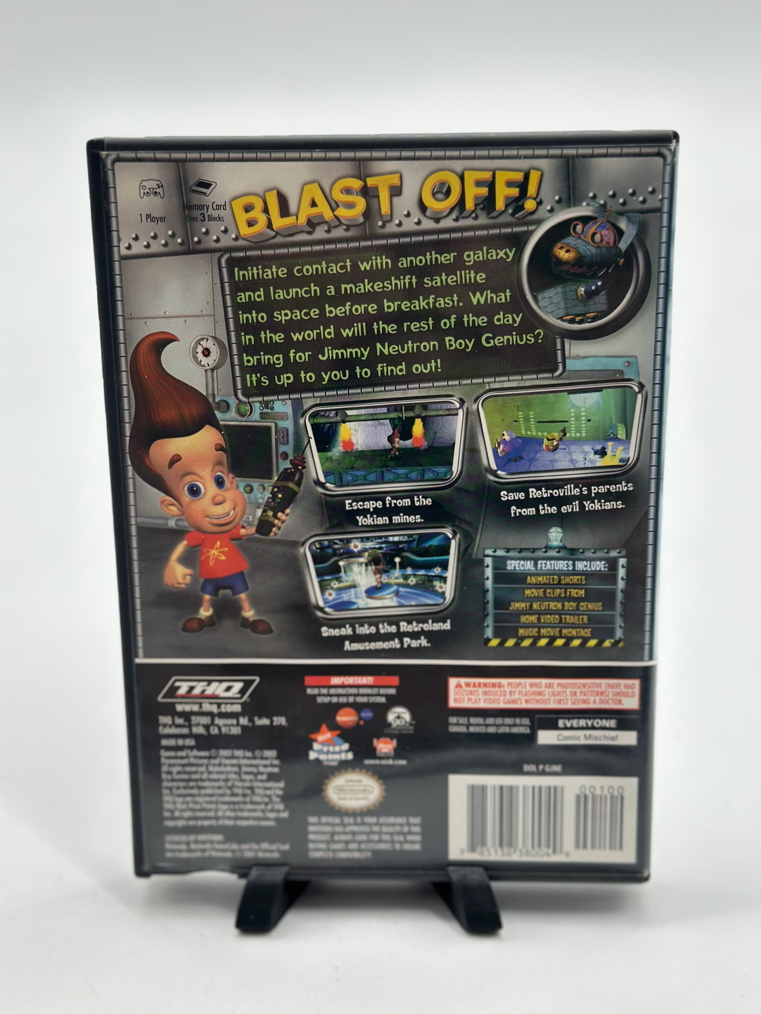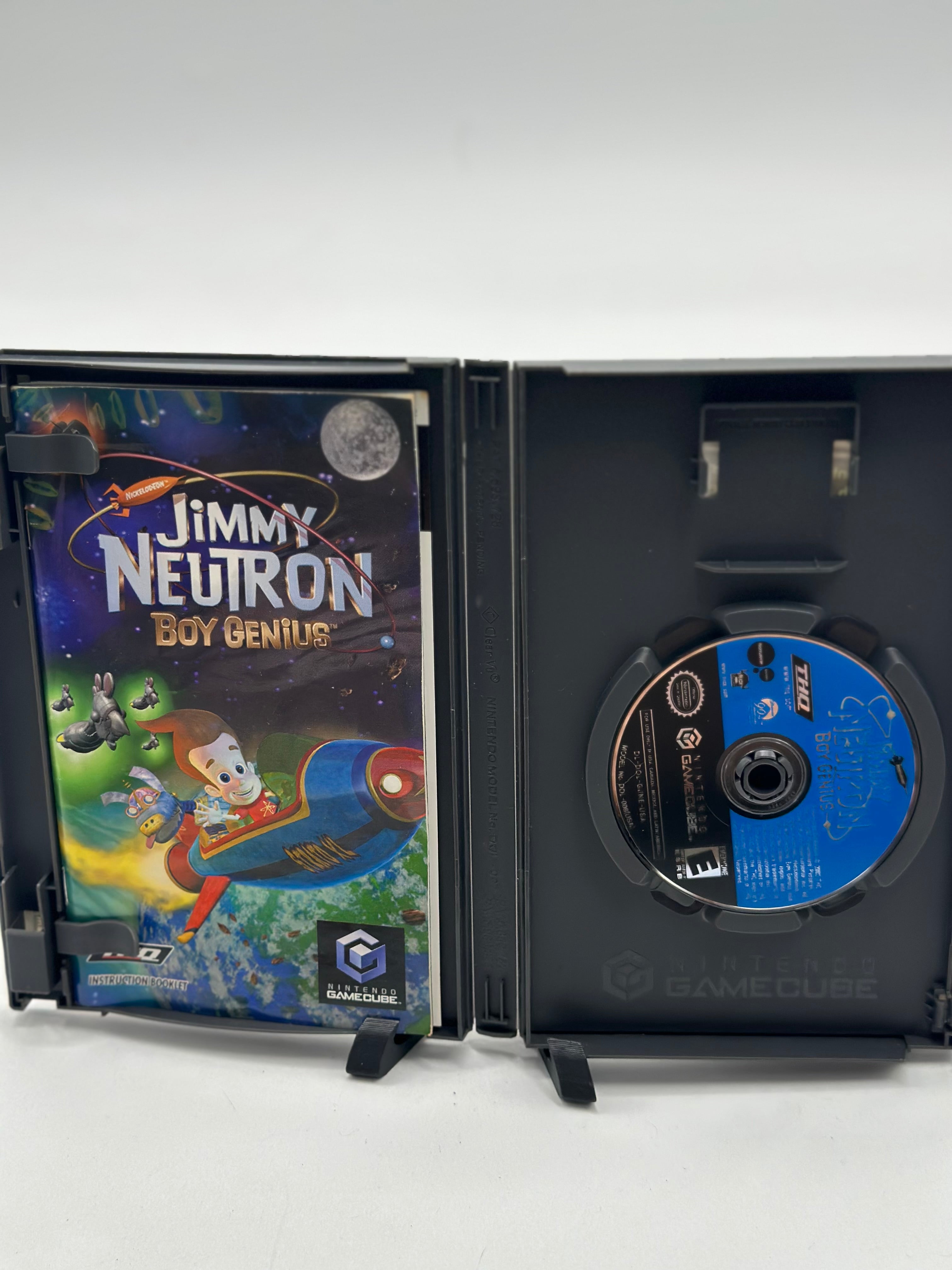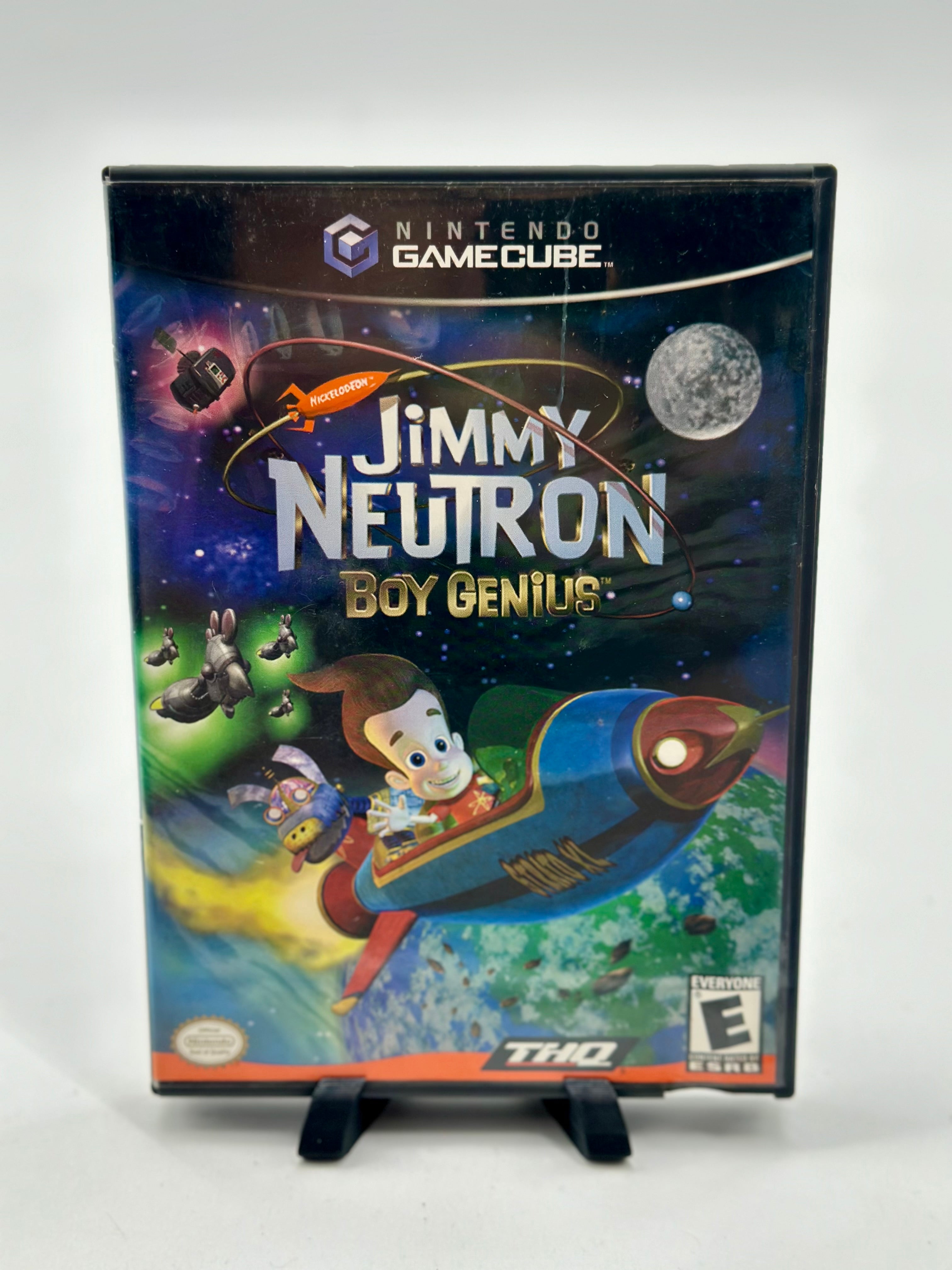 Jimmy Neutron Boy Genius for the Nintendo GameCube is a 3D adventure platformer where players control the young super-genius Jimmy Neutron and his robot dog Goddard to save the world from various threats, using an array of inventions and gadgets. The game features multiple levels set in locations like Jimmy's house, the Asteroid Surface, and the amusement park Retroland, where players must solve puzzles and defeat enemies.