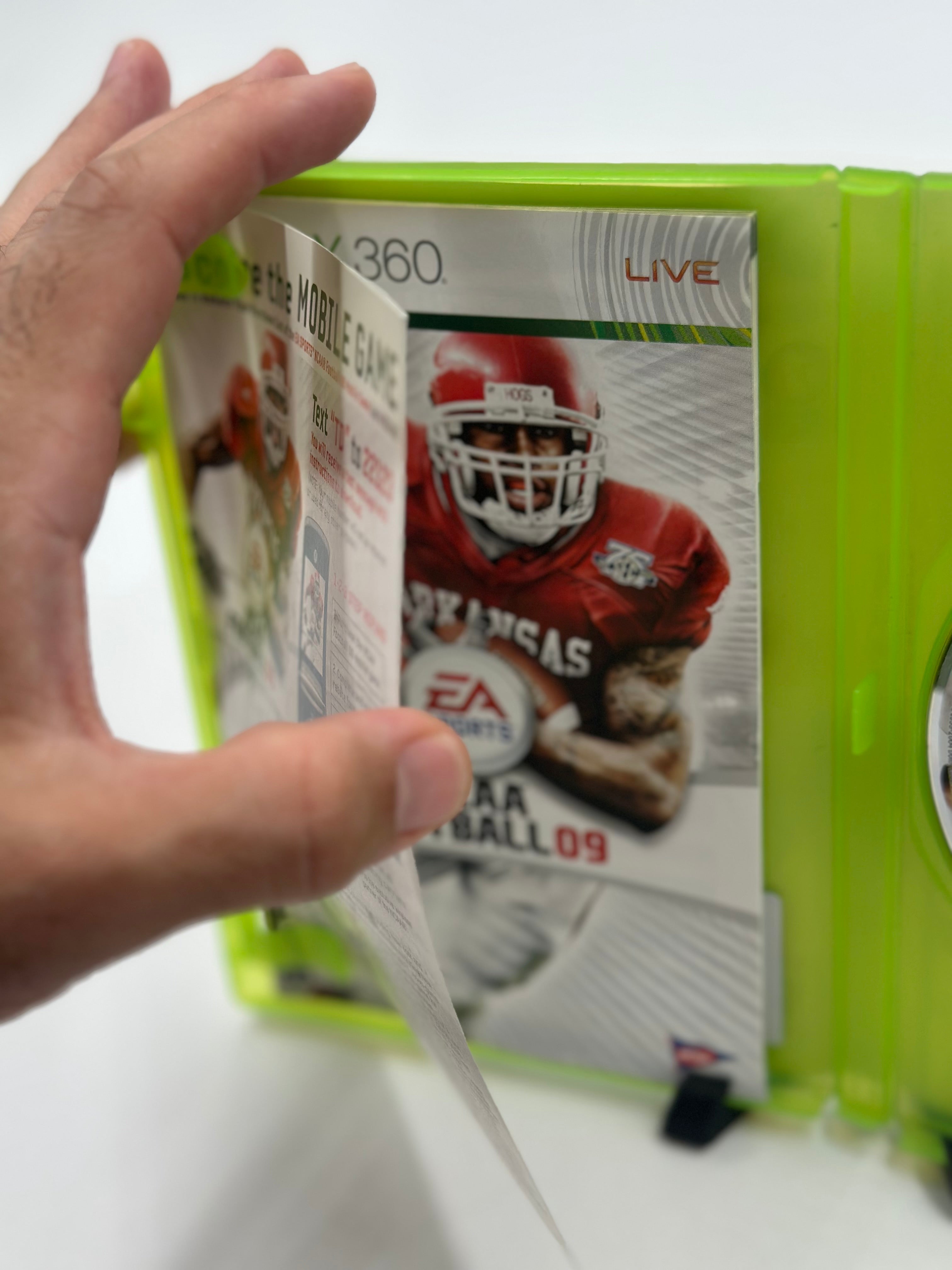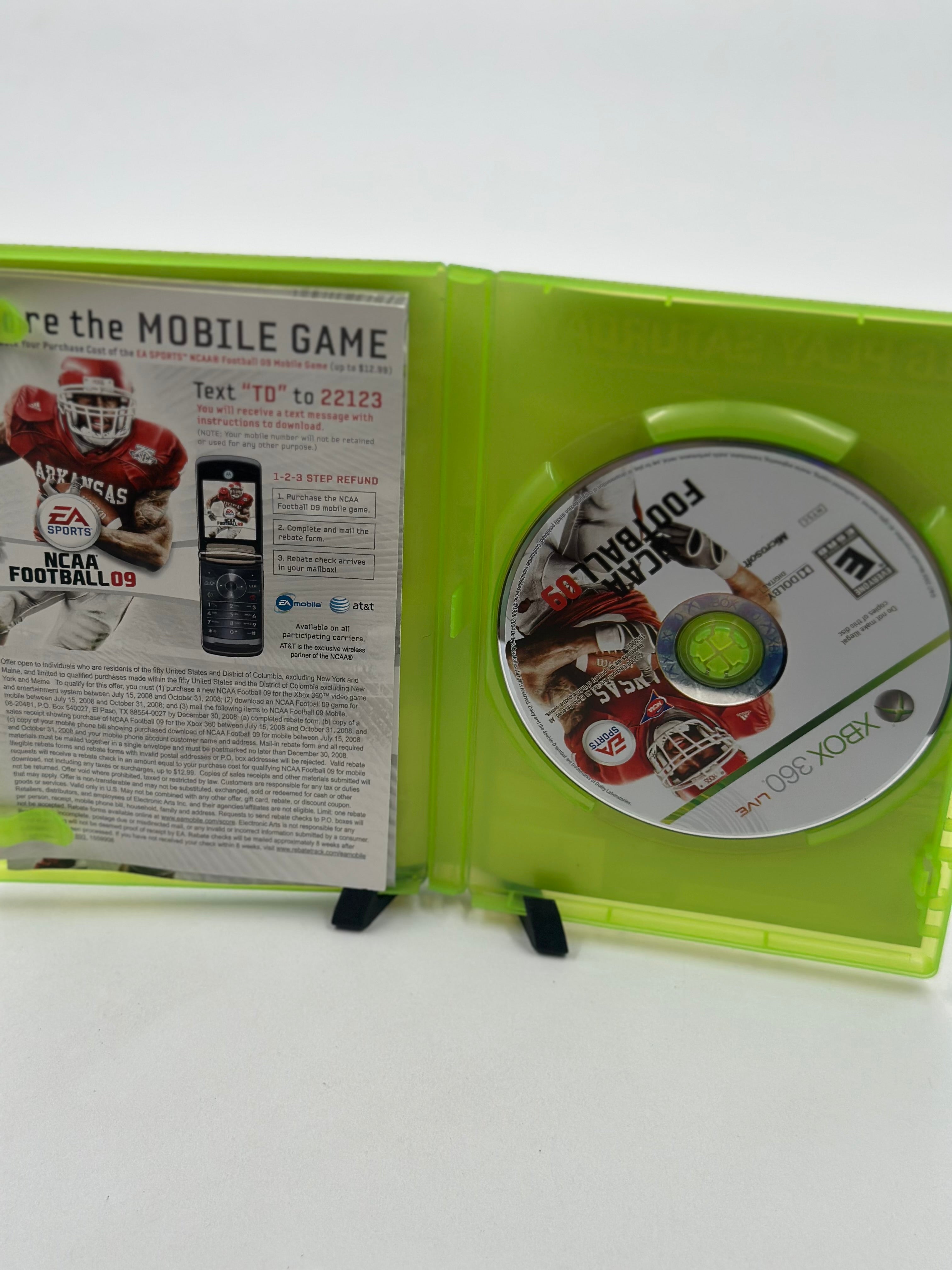 NCAA Football 09 for Xbox 360 is a college football simulation game known for its authentic collegiate atmosphere, including stadium elements like school colors, mascots, and unique celebrations. The game features enhanced gameplay mechanics such as an improved tackling system, breakaway moves for running backs, and a new quarterback quiz after interceptions. It also includes a robust Dynasty mode with features like newspaper and ESPN updates and the ability to convert between offline and online dynasties.