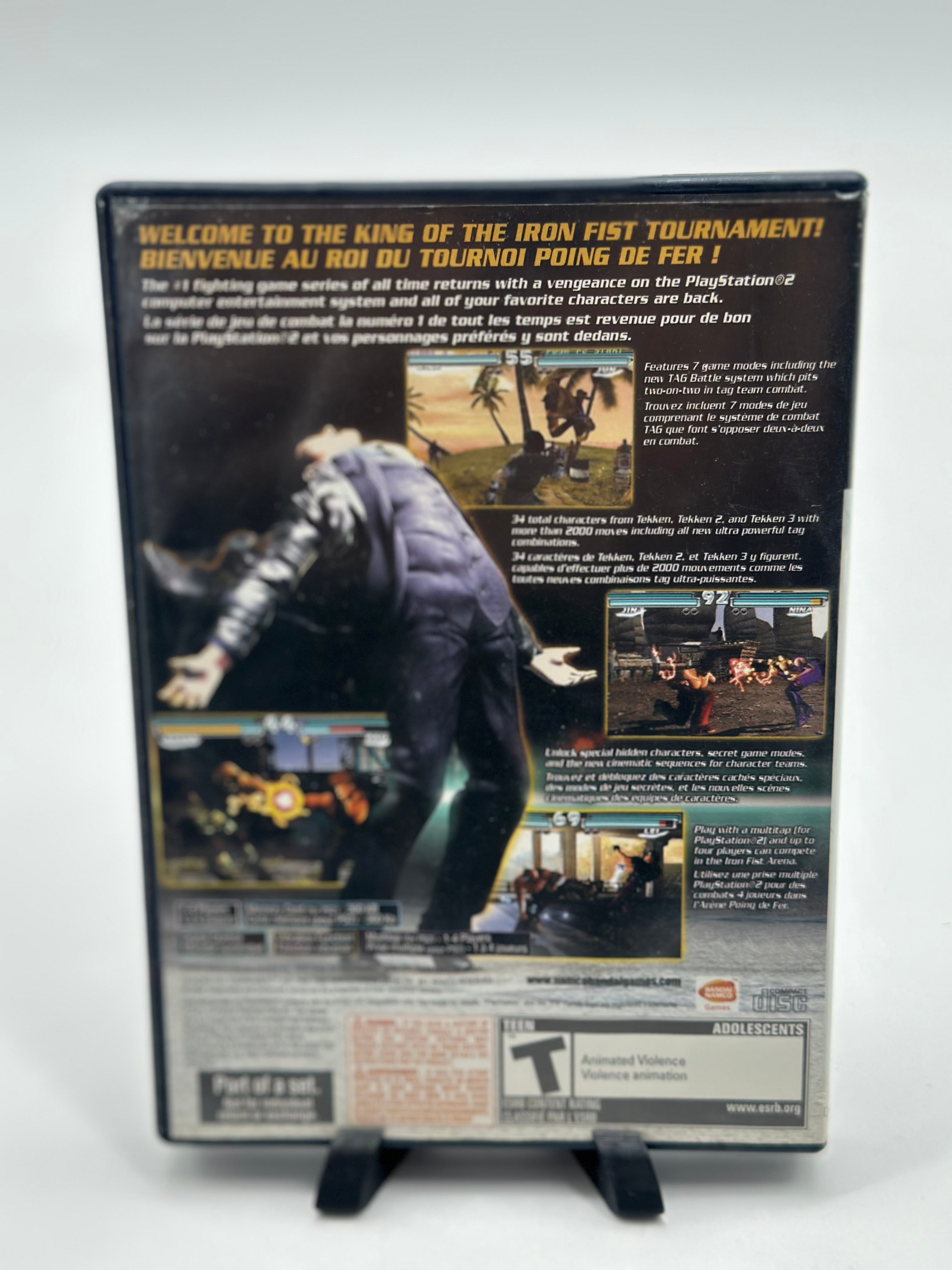Tekken Tag Tournament for the PlayStation 2 is a fighting game featuring tag team battles, allowing players to switch between two characters during combat. The game includes over 35 characters from previous Tekken titles, such as Tekken 2 and Tekken 3, and features revamped graphics and new modes. Players can utilize tag throws, tag assaults, and bound hits to extend combos and strategic tagging to recover health and gain temporary boosts. The game also includes single-player modes like one-on-one, time attack, and survival, as well as a Tekken Bowling minigame.