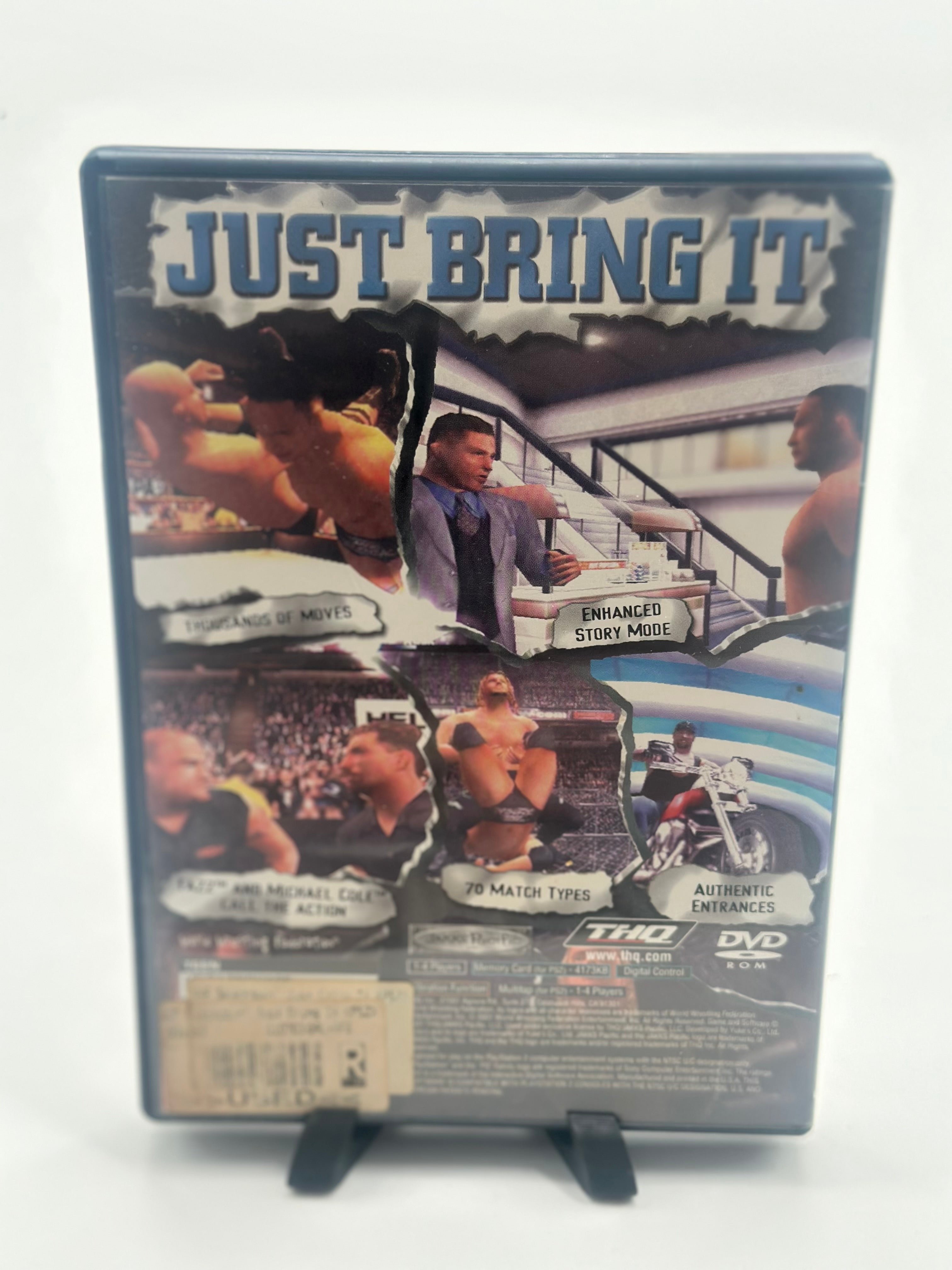 WWF SmackDown! Just Bring It! offers more customizable features, including Titantron-enhanced entrances, over 5,000 Create-a-Wrestler parts, and a Layer System. As you fight inside or outside the ring, you'll find potted plants, soda cans, fire extinguishers, chairs, and tables to knock on your opponent's head.